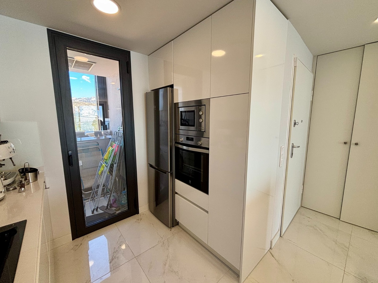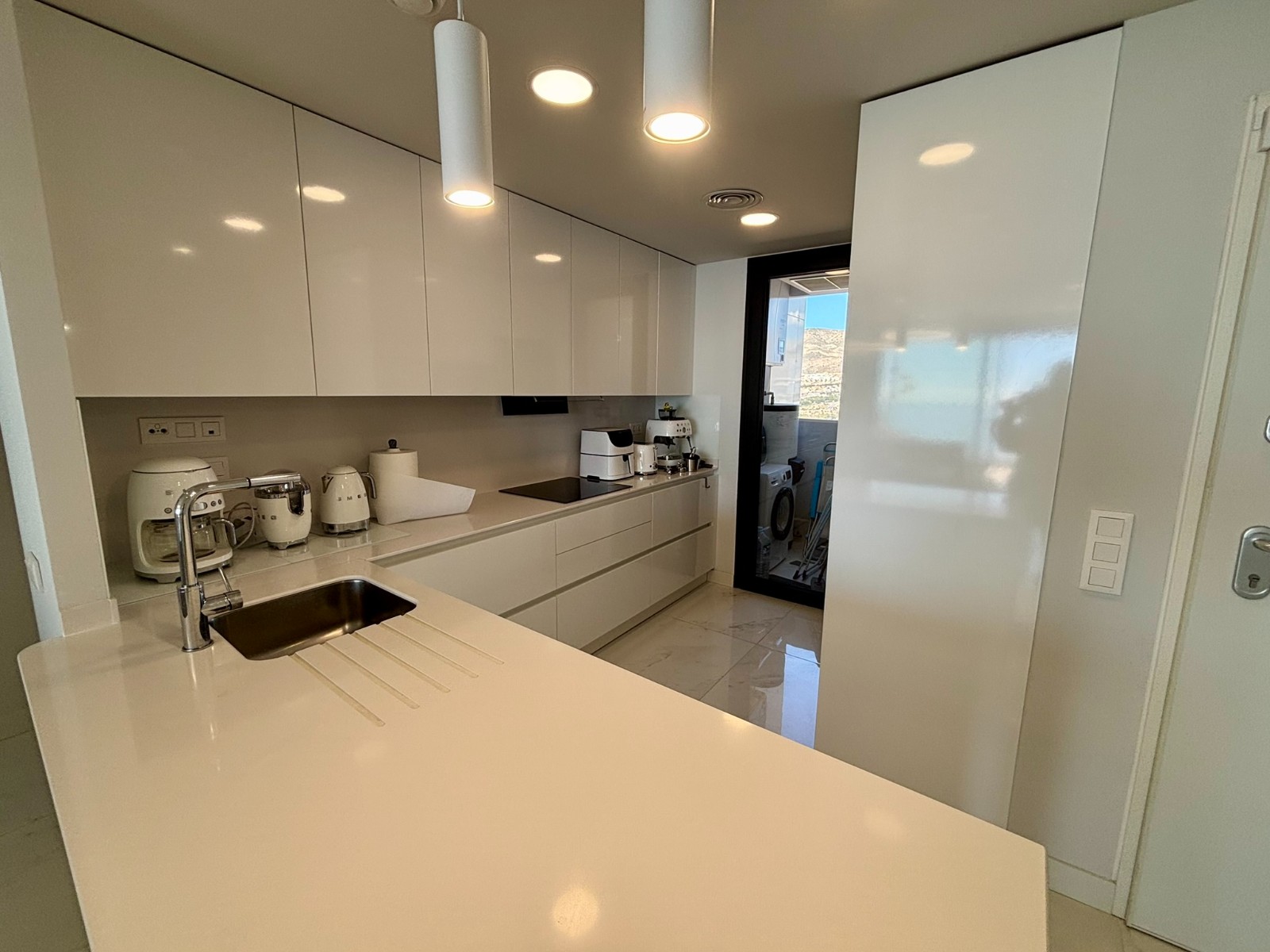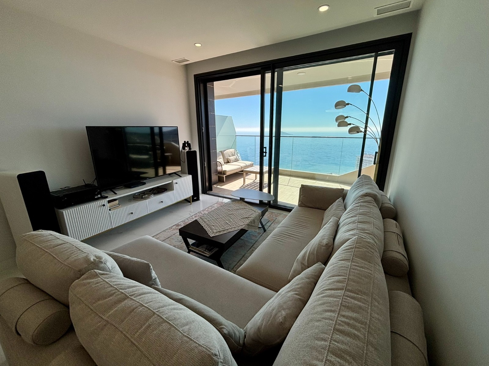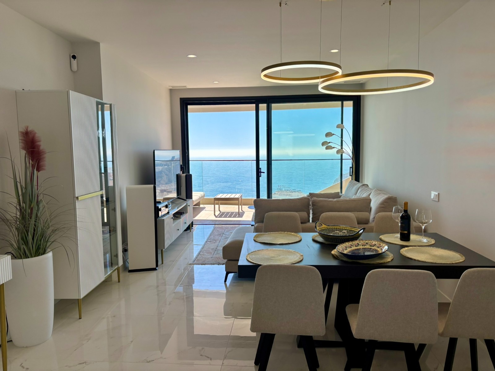 El interior ofrece una distribución elegante y funcional. Cuenta con una cocina americana moderna, equipada con electrodomésticos panelados y con galería independiente, integrada con un luminoso salón desde el que las vistas al mar se convierten en las auténticas protagonistas de la vivienda.