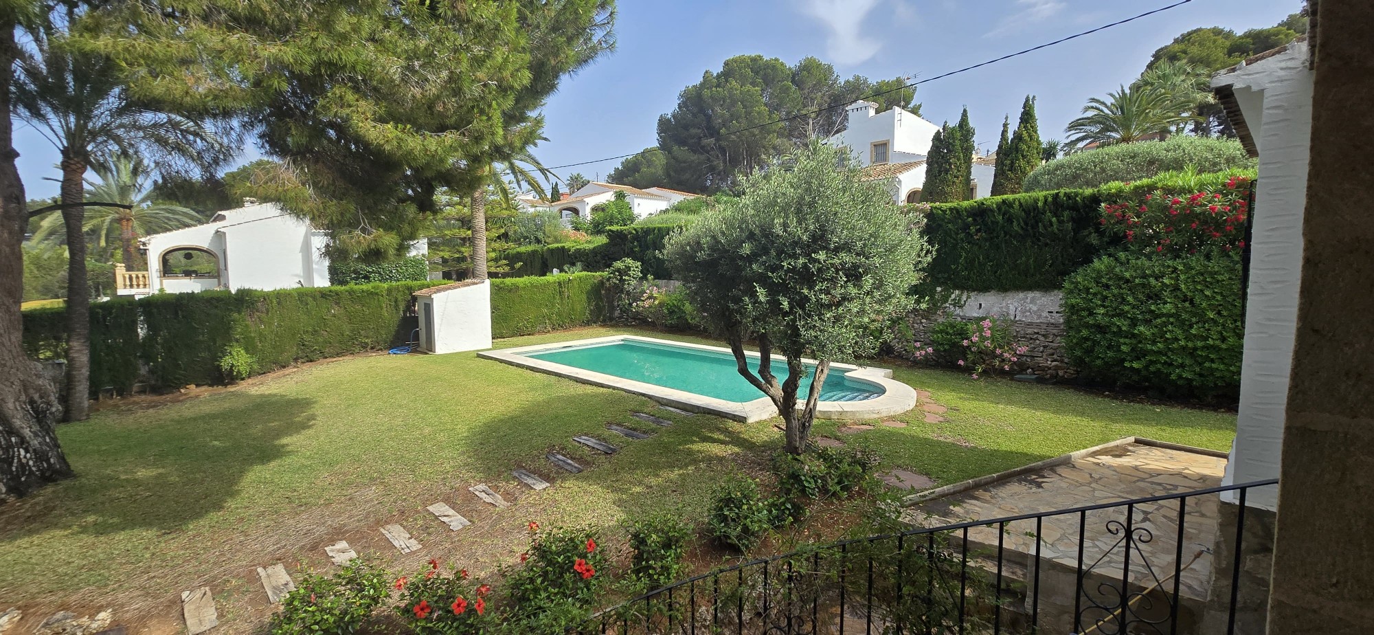 The exterior of the property is one of its standout features: a private pool, barbecue area, mature garden, and garage — all in excellent condition and ready to move into, fully furnished.